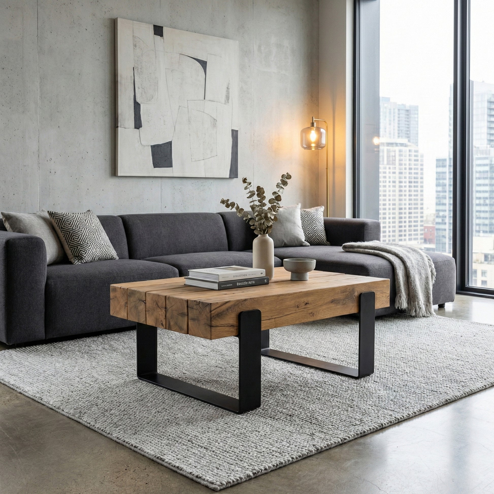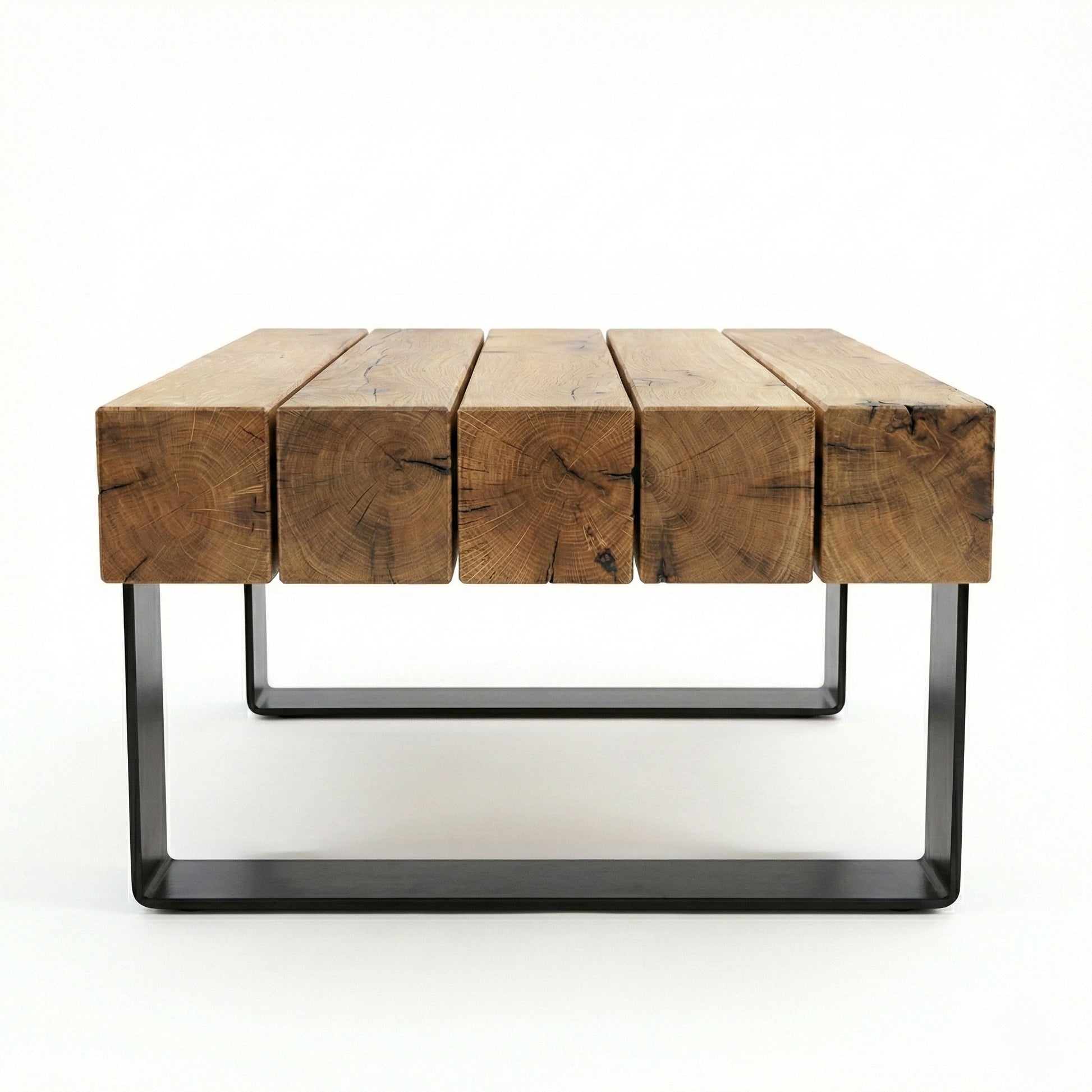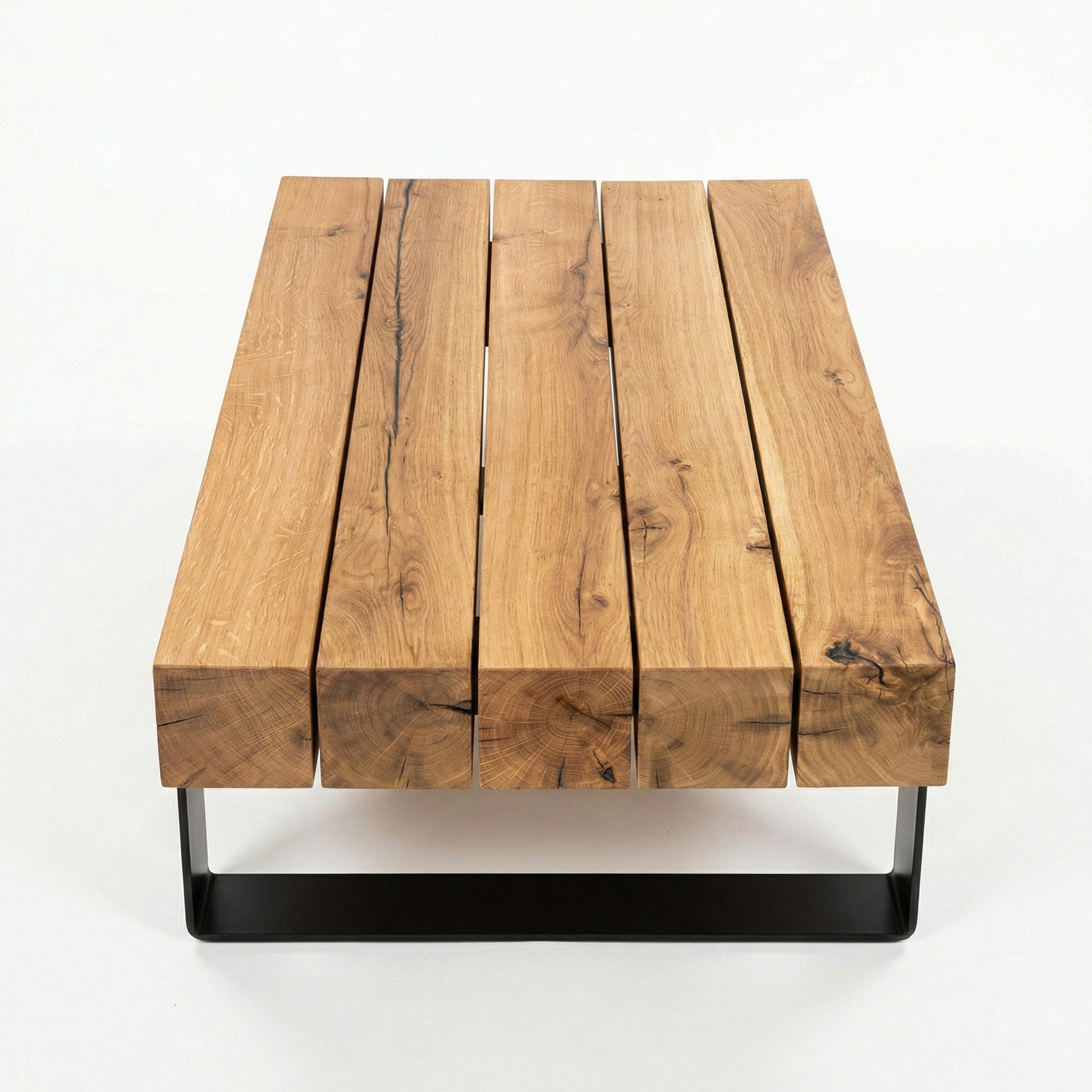 Unser Balken Wohnzimmertisch verbindet markantes Industrie-Design mit der kraftvollen Ausstrahlung massiver Eiche. Gefertigt aus fünf massiven Eichenbalken überzeugt er durch seine klare, geradlinige Formensprache und sein charakterstarkes Erscheinungsbild. Das schwarz gepulverte Stahlgestell unterstreicht den industriellen Look und bildet einen modernen Kontrast zur warmen Holzstruktur.
